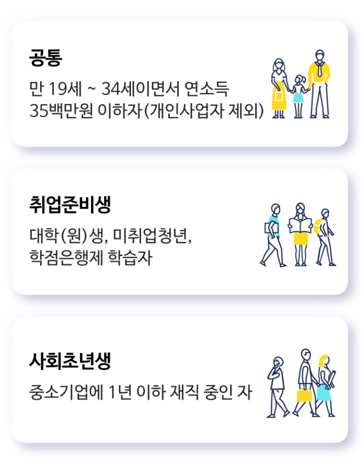 기본적인 공통 자격조건으로는 만19세~만34세까지이고 연소득이 3500만원 이하여야 합니다. 하지만 앞에서 말했던것처럼 무직자도 가능합니다.